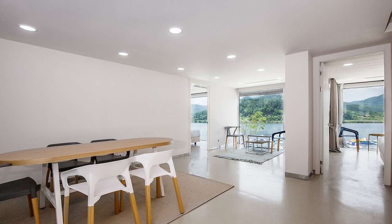 남이섬과 북한강 전경이 파노라마 뷰로 펼쳐지는 펜트하우스는 60평형 큼직한 객실 사이즈와 거실 겸 주방, 온돌방 2개, 침대방 2개가 준비되어 프라이빗한 가족 여행에 인기가 높다.