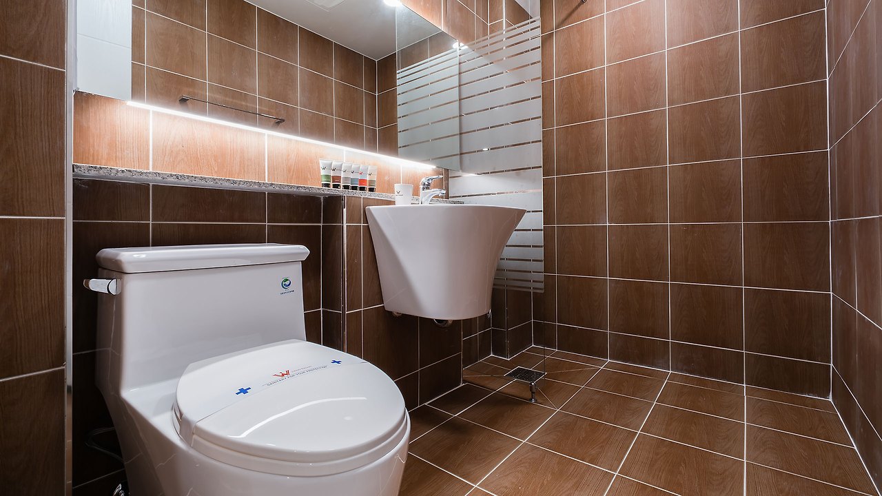 세면대를 기준으로 왼쪽은 변기, 오른쪽은 샤워부스가 설치되어 있어 4인 가족이 머물기에 적당하다. 어메니티는 샴푸, 바디워시, 클렌징 폼 등이 일회용품으로 준비돼 있고, 그 외에 수건과 헤어드라이기 등이 갖춰져 있다.