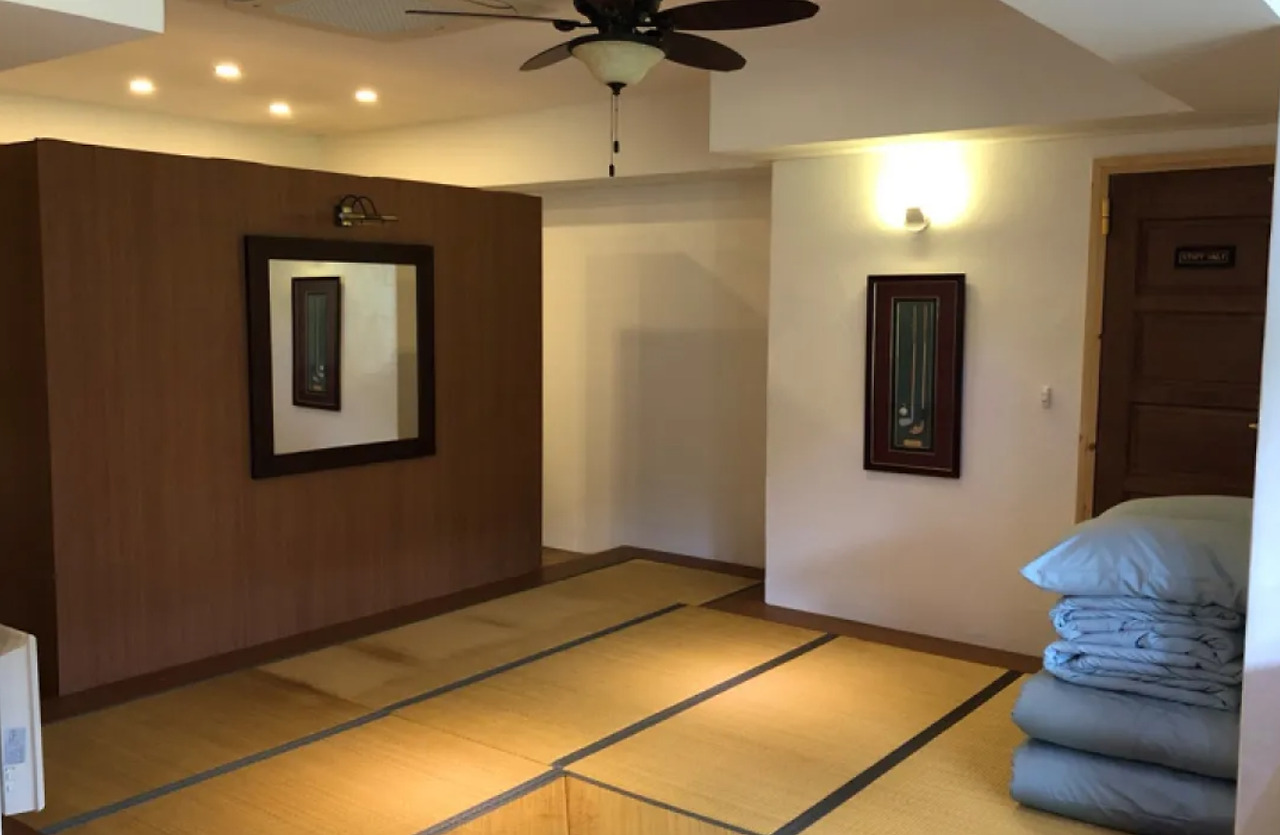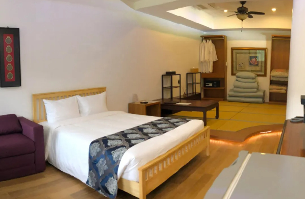 큼직한 침대와 다다미 자리와 침구가 준비되어 널찍한 편으로 아이 동반 여행에 추천하는 객실이다.