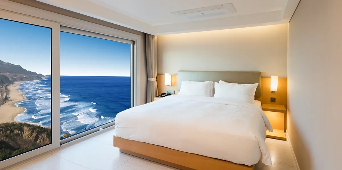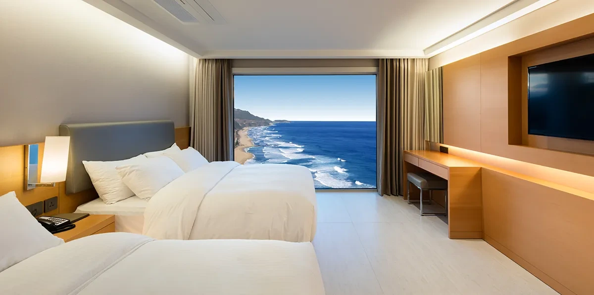 가성비와 일출 오션뷰를 모두 잡아, 커플에게 인기가 높은 정동진 썬크루즈호텔 대표 객실이다. 더블 베드와 55인치 TV, 블루투스 스피커 등을 갖췄다. 발코니 밖으로 나가면, 동해와 주변 경관을 한눈에 볼 수 있다.