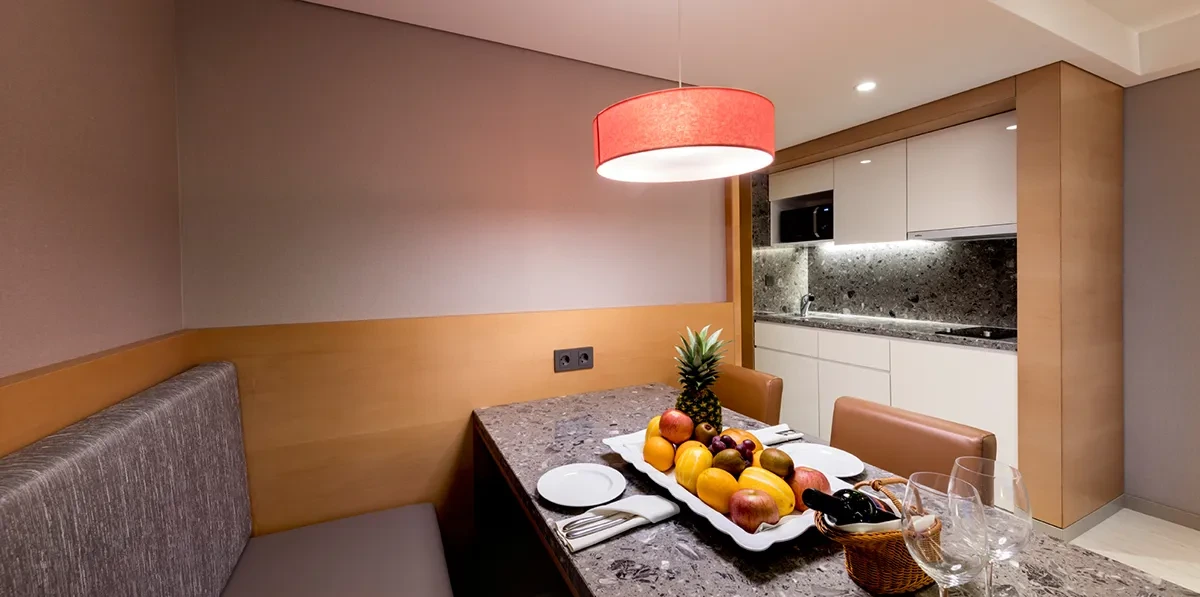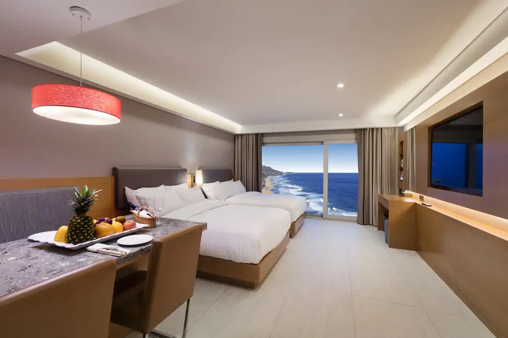 가족 여행자라면 여유로운 공간이 인상적인 디럭스 트윈 룸을 추천하고 싶다. 더블 베드 2개를 구비해, 최대 4인까지 투숙 가능하다. 콘도형인 만큼 취사 가능한 주방을 갖췄다. 룸콕 호캉스 하기에 안성맞춤이다.