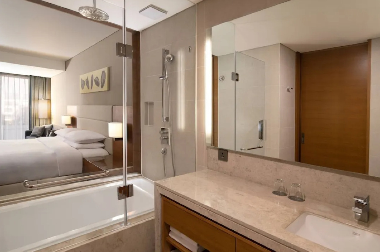 욕실은 욕조 또는 샤워부스가 설치되어 있다. 욕실 벽면이 유리로 되어 있지만, 블라인드도 설치되어 있으니 크게 걱정하실 필요는 없다. 어메니티로는 샴푸, 린스, 바디워시, 비누, 칫솔, 드라이기, 수건 등 웬만한 건 모두 준비되어 있다.