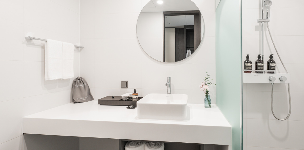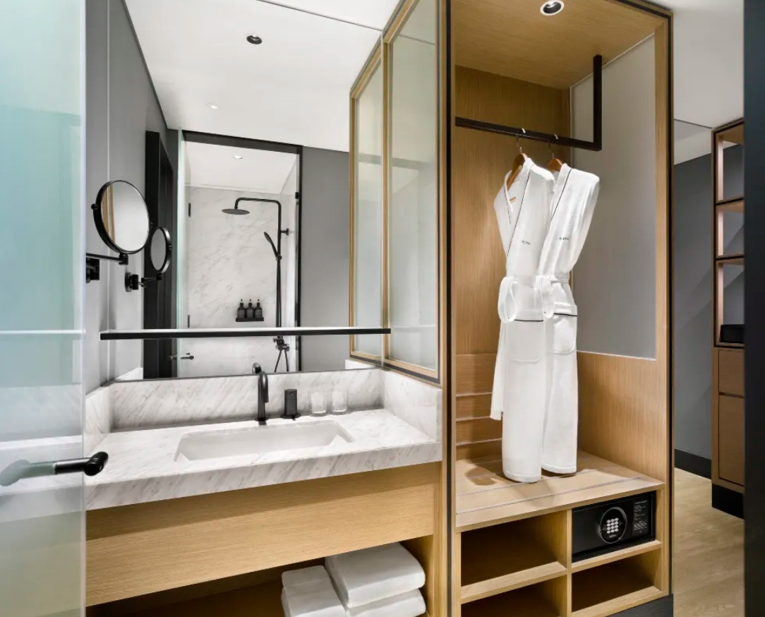 욕실에는 욕조 없이 샤워부스만 설치되어 있다. 어메니티는 샴푸와 헤어 컨디셔너, 바디워시, 바디로션, 비누, 치약과 칫솔, 면봉 등이 기본적으로 준비되어 있다. 이와 함께 수건, 헤어드라이어, 샤워가운, 슬리퍼도 준비되니 개별적으로 화장품, 세안제, 면도기 정도만 챙겨 오면 될 거다.