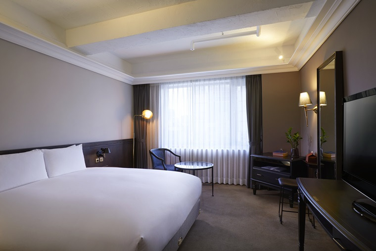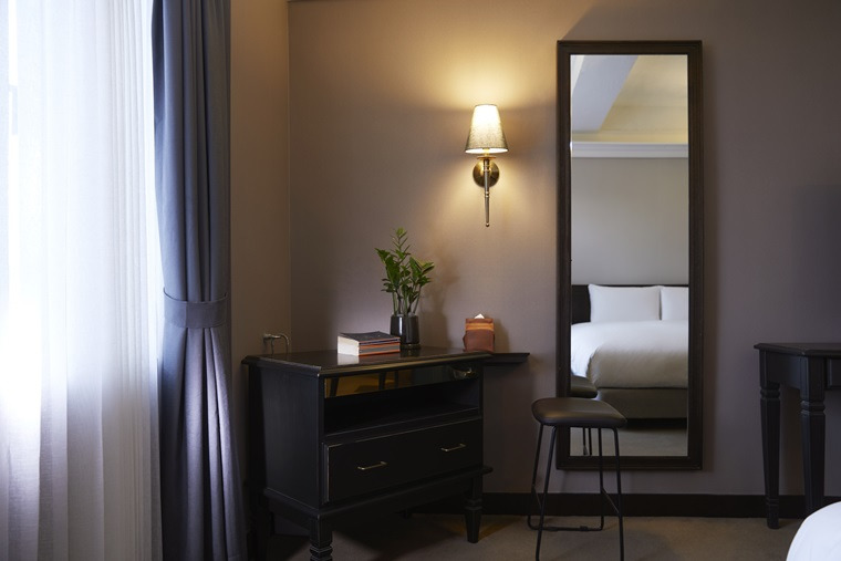 메종글래드 제주의 스탠다드룸은 헤리티지와 모던함이 조화를 이루는 객실이다. 40여 년의 역사가 고스란히 담긴 원목 데스크와 서랍장, 조명 등을 업사이클 해 사용하고 있다. 다른 호텔에서는 느낄 수 없는 특별한 감성을 경험해볼 수 있을 거다.
