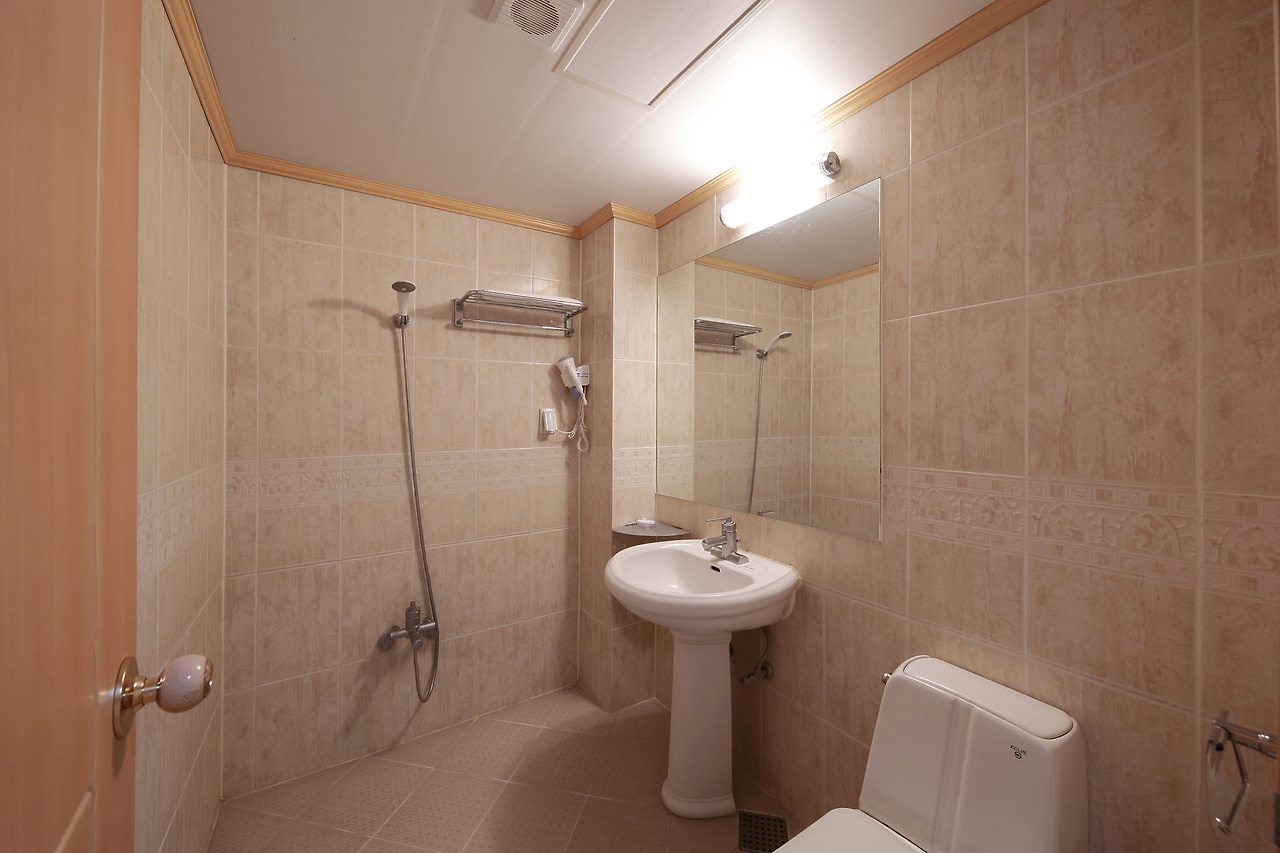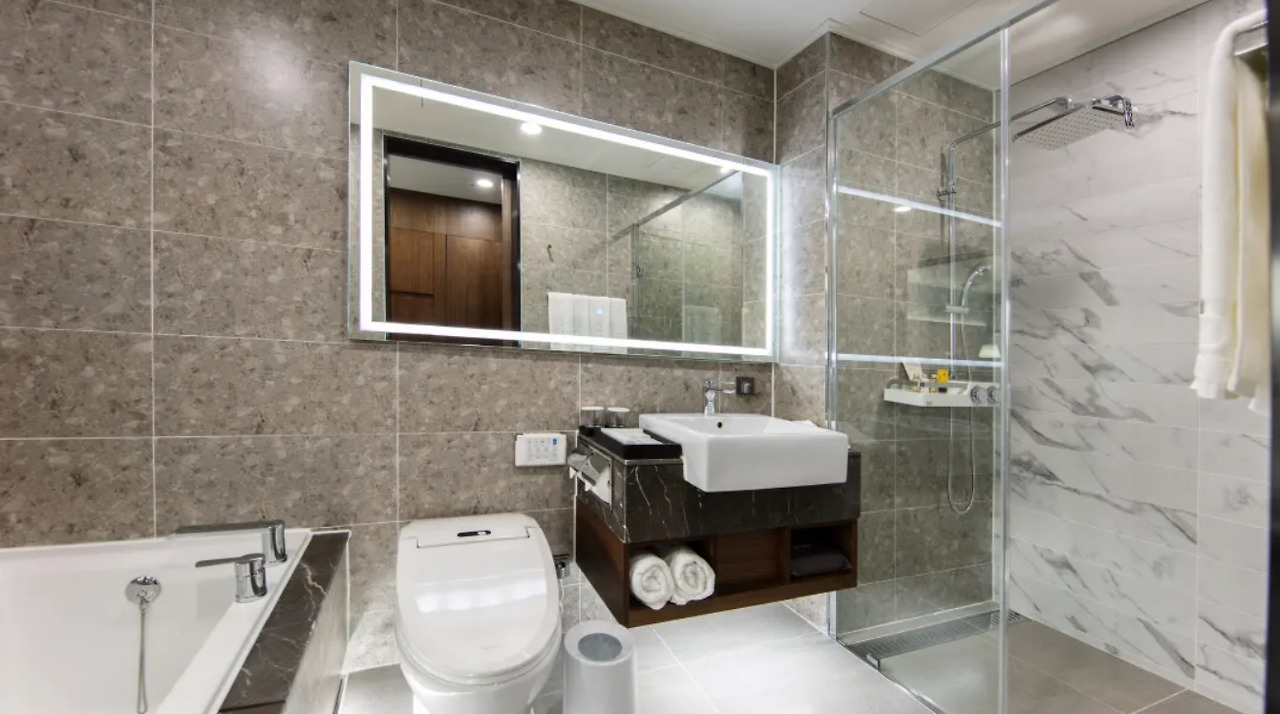 욕실은 널찍하게 설계되어 욕조와 샤워부스가 모두 준비되어 있다. 샴푸, 린스, 바디워시, 바디로션, 비누, 헤어드라이기, 수건 등 기본적인 어메니티가 제공되며 치약과 칫솔, 면도기는 개별적으로 준비해 와야 한다.