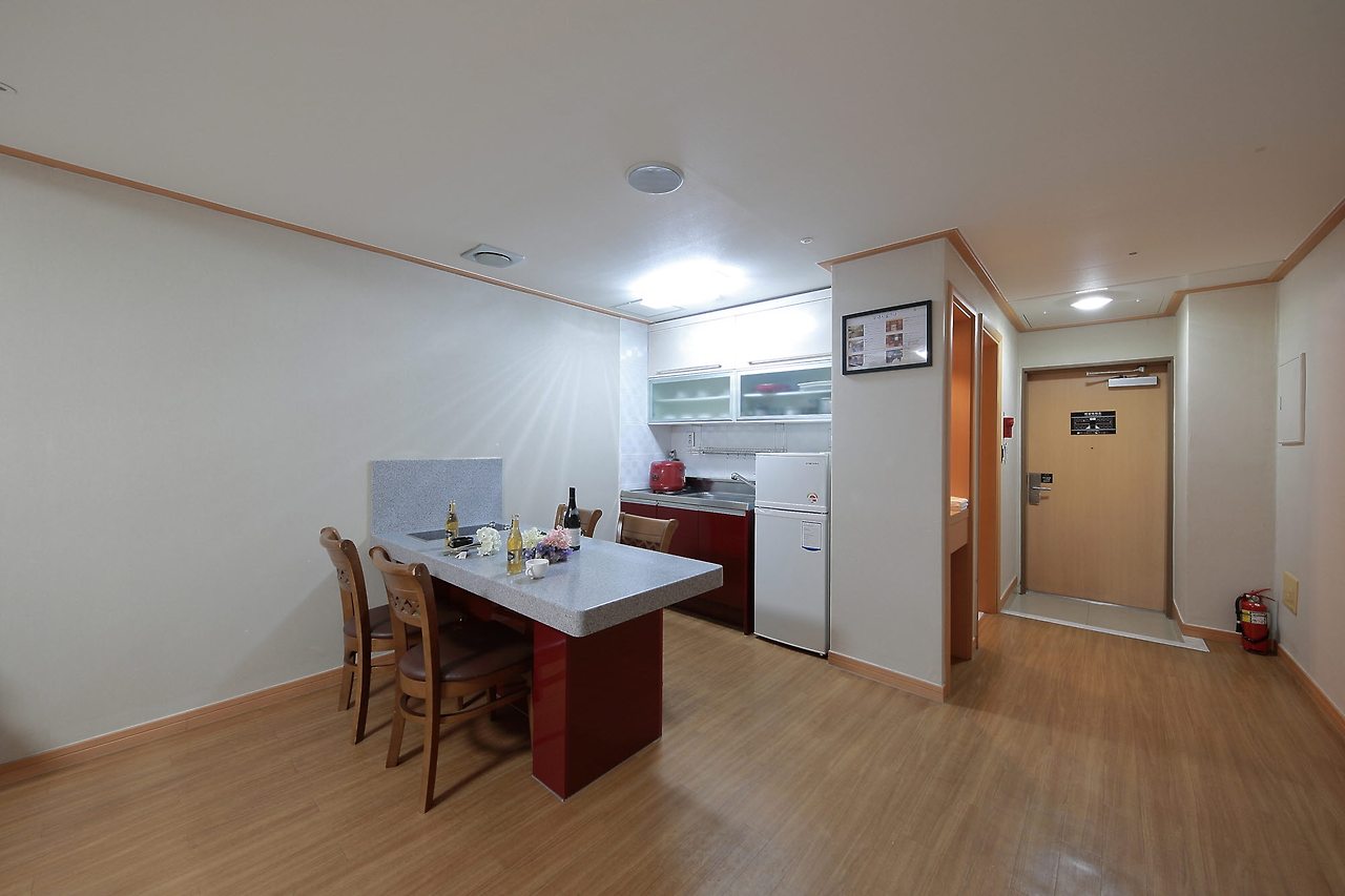 4인용 식탁과 냉장고, 싱크대, 인덕션, 그밖에 식기류를 비롯한 취사도구가 준비돼 간단한 조리가 가능해 가족 여행 숙소로 최고다!