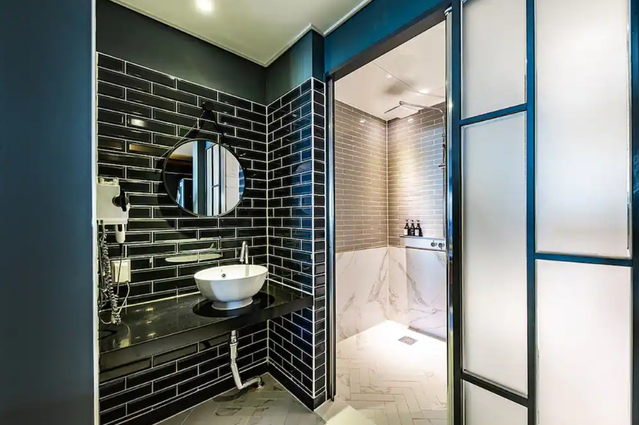 세면대가 분리돼 있다. 샴푸, 린스, 바디워시, 비누, 치약, 칫솔, 빗, 클렌징폼, 면도기, 면봉, 화장솜, 샤워타월, 수건, 드라이기 등 웬만한 어메니티는 모두 준비된다. 심지어 입욕제까지 제공되니 한달살기 짐이 한결 가벼워질 거다.