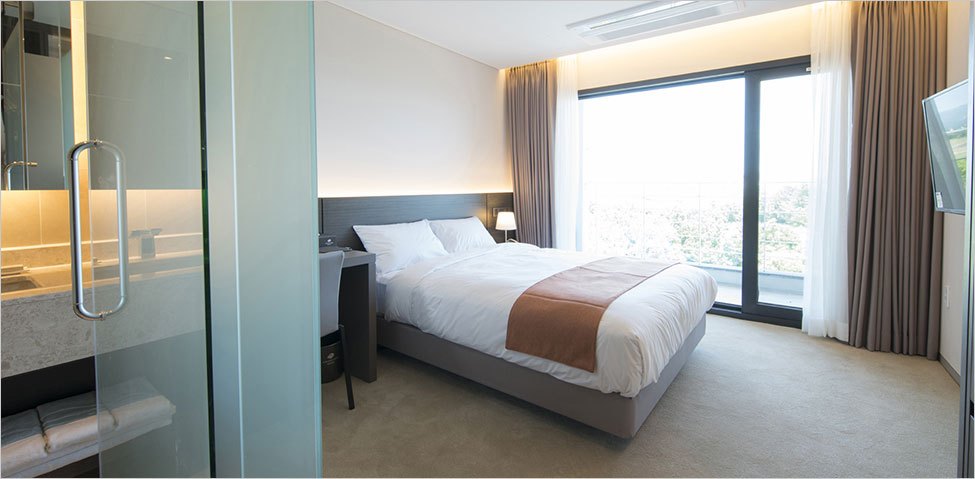 제주 중문 호텔 아리아의 스탠다드 킹은 동일한 가격대 객실에 비해 넓고 청결하게 관리되어 있어 만족스럽게 머물 수 있다. 특히 유럽풍 분위기로 꾸며진 인테리어와 오션뷰를 감상할 수 있는 아름다운 전망이 매력적이라 혼자 여행 또는 커플 여행 숙소로 인기가 높다.