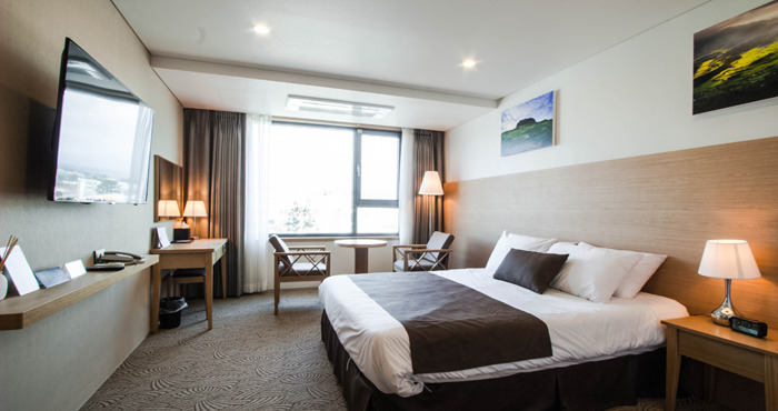 제주 베니키아 중문 호텔 스탠다드 더블룸은 동급 객실 크기보다 널찍하고, 깔끔하면서 아늑하게 꾸며져 있다. 일부 객실에서는 제주의 바다까지 감상할 수 있도록 꾸며져 있어 인기가 높다.