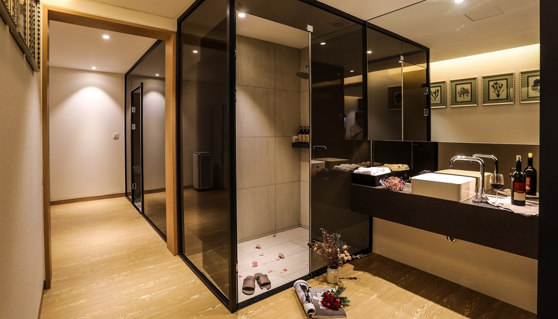 욕실에는 욕조와 샤워시설이 모두 갖추어져 있다. 샴푸와 린스, 바디워시, 비누 등이 모두 준비되고 드라이기, 고데기, 칫솔, 치약, 가운 등 갖추어져 있다.