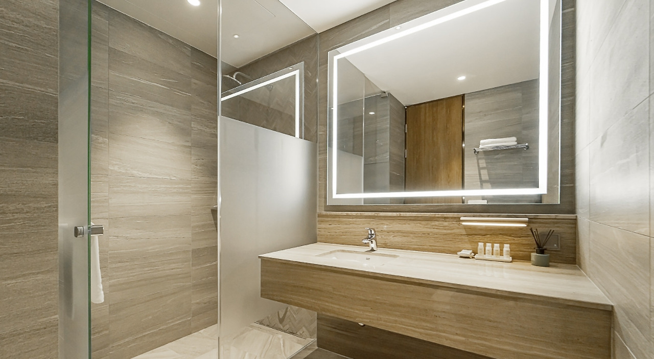 욕실은 샤워부스 또는 욕조가 설치되어 있다. 어메니티로는 샴푸와 린스, 바디워시, 비누, 칫솔과 치약, 수건, 드라이기 등이 준비된다. 세안제와 면도기는 준비되지 않으니 개별적으로 챙겨 와야 한다.