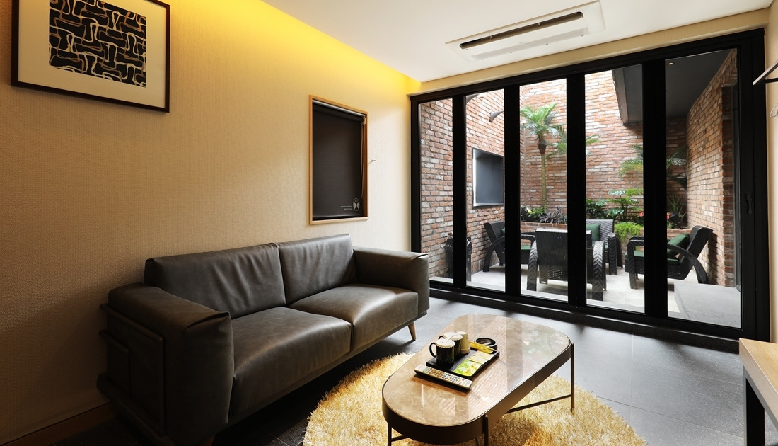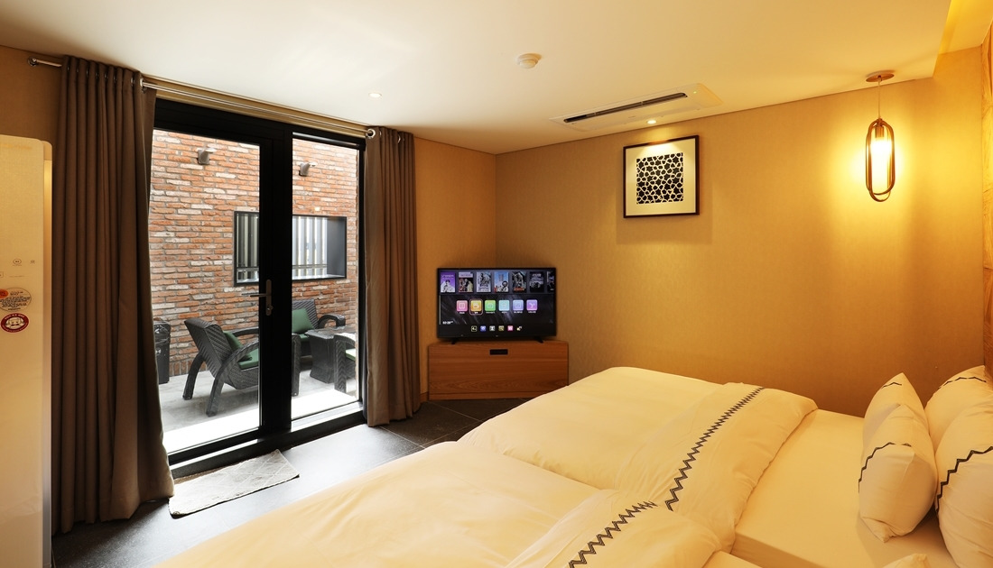마리 전주호텔 터미널점은 동급 대비 큼직하고 다양한 객실을 보유해 인기를 끌고 있다! 그중에서도 테라스 가든 스위트는 최대 6인까지 머물 수 있는 가장 큰 객실로 객실 내 2개의 더블베드와 소파, 티 테이블, 공기청정기, TV, 노트북, 에어컨, 트롬 스타일러 등이 준비되어 있다.