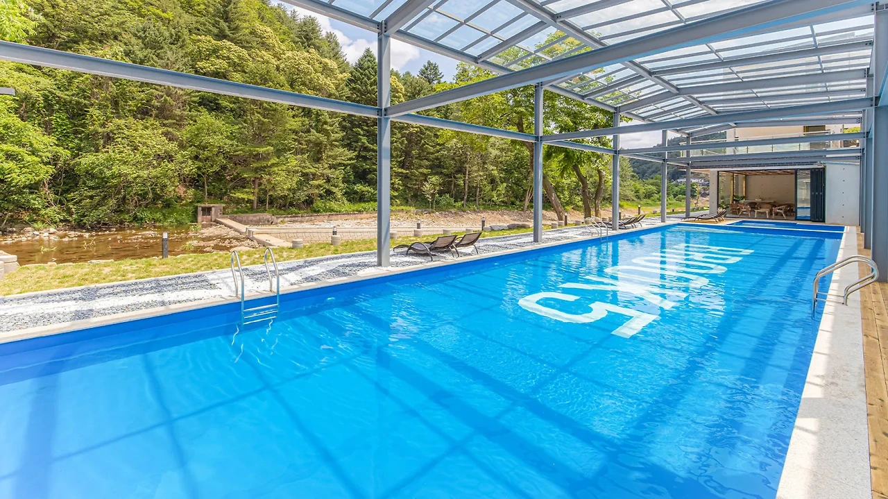 가족풀빌라펜션답게 브룩5에는 대형 야외 수영장도 있다. 따뜻한 온수풀로 4계절 내내 언제든 이용할 수 있다. 성인풀과 유아풀로 나뉘어 아이와 함께 가기에도 참 좋다.