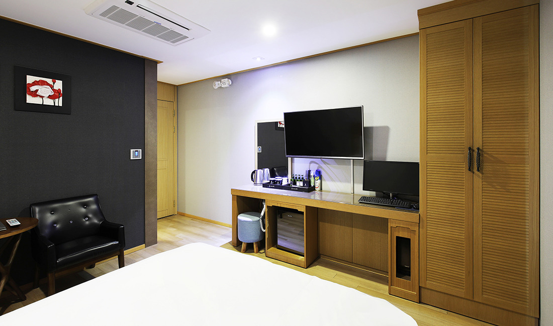 내부에는 널찍한 더블베드와 TV, PC, 테이블과 안락의자 등이 갖춰져 있고 특히 넷플릭스, 웨이브, 무비온 등 OTT 플랫폼까지 전부 무료로 볼 수 있다.