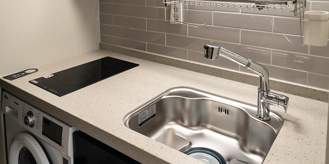 조식은 따로 제공되지 않지만, 인덕션과 전자레인지, 냉장고, 커피포트 그리고 간단한 조리를 할 수 있도록 식기류까지 준비되어 있다. 아침은 물론 점심과 저녁까지 충분히 챙길 수 있을 거다. 물론 주변에 맛집도 많아서 배달 한 번이면 해결될 거다.