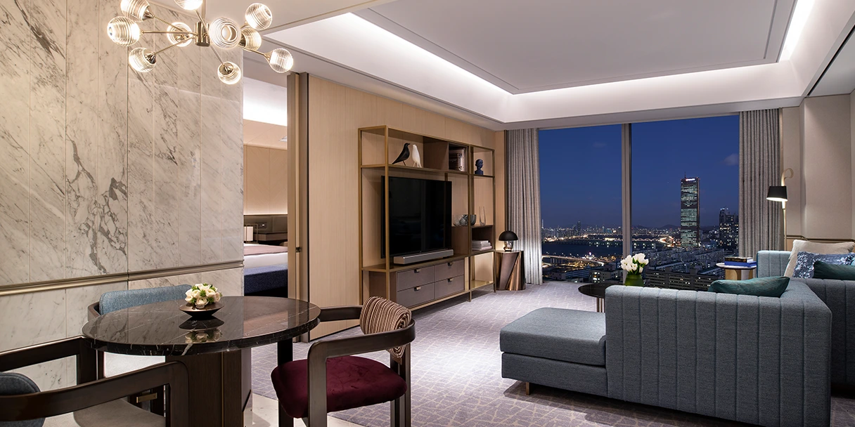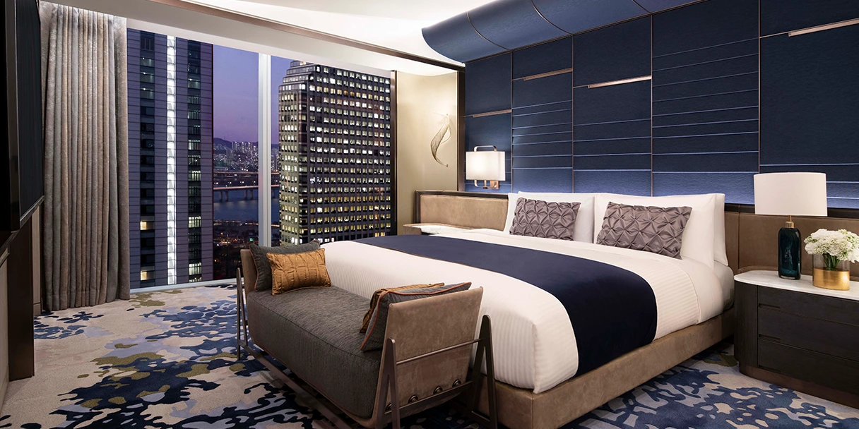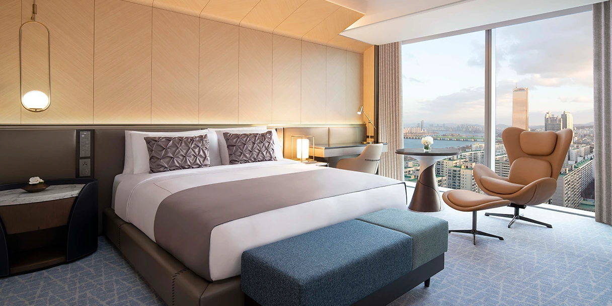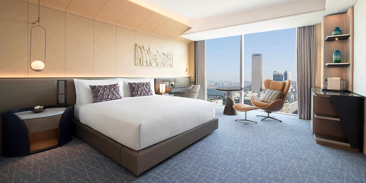 페어몬트 앰배서더 서울 객실은 총 6가지 타입으로 나뉜다. 전 객실에서 도심을 내려다볼 수 있도록 통창을 설치해 놨으며, 전망은 일명 현대백화점뷰와 리버뷰 중 선택 가능하다. 의외로 백화점뷰가 더 사랑받고 있다.