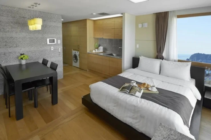 오션팰리스 호텔 스탠다드 더블룸은 거실, 침실, 욕실이 완벽하게 구분되어 있고, 공간이 넓은 만큼 큼직한 침대, 협탁, 스탠드, TV, 화장대, 테이블, 식탁, 싱크대, 냉장고, 세탁기 등 이 모든 것이 객실 안에 준비되어 있다.
