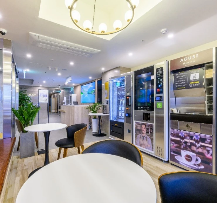로비 층에는 향긋한 커피를 언제든지 편히 즐길 수 있는 전자동 에스프레소 머신이 준비되어 있다. 24시간 운영되며 음료에 따라 비용은 상이하다.