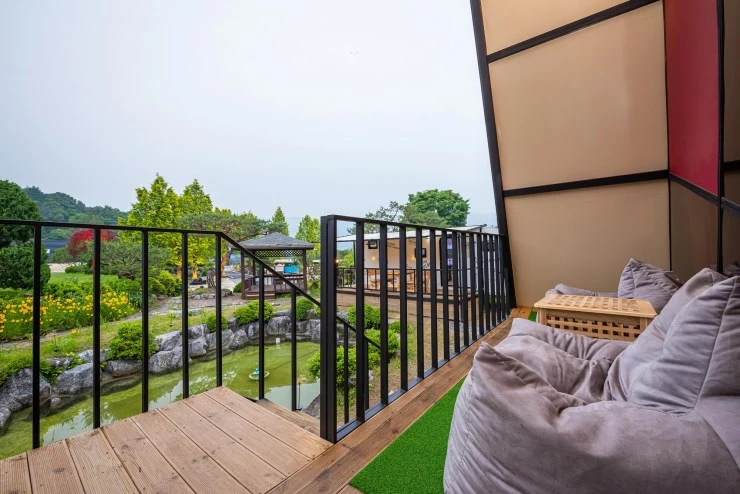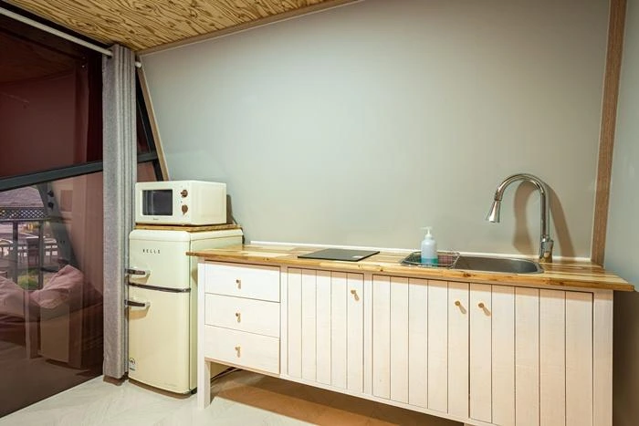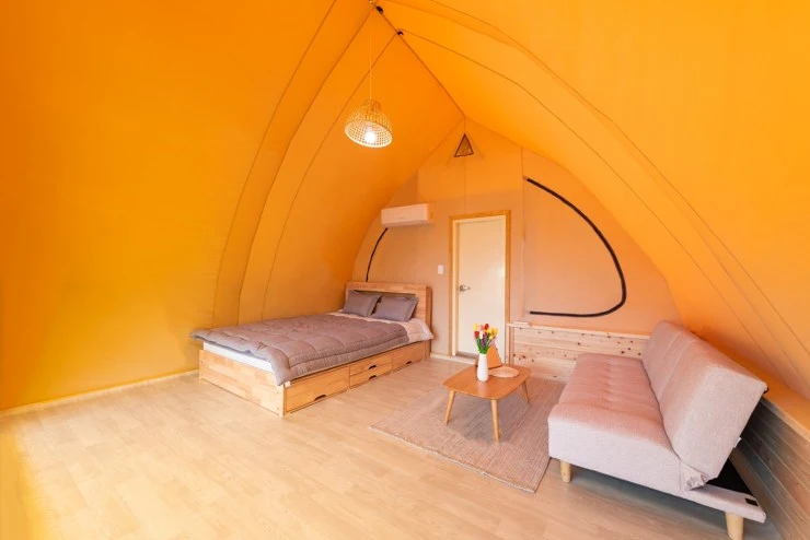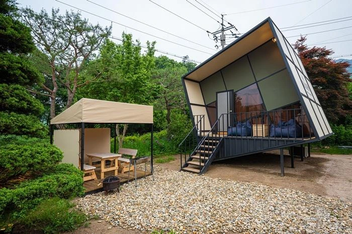 더설렘의 큐브 글램핑은 멀리서도 눈에 띄는 외관을 자랑하는데, 객실 앞 발코니에 놓인 빈백 소파와 내부 공간은 거실 겸 주방, 복층에 아늑한 침실까지 넓진 않지만 짜임새 있게 갖춰져 있어 커플 여행에 제격인 신축 포천 글램핑 숙소로 인기가 높다.