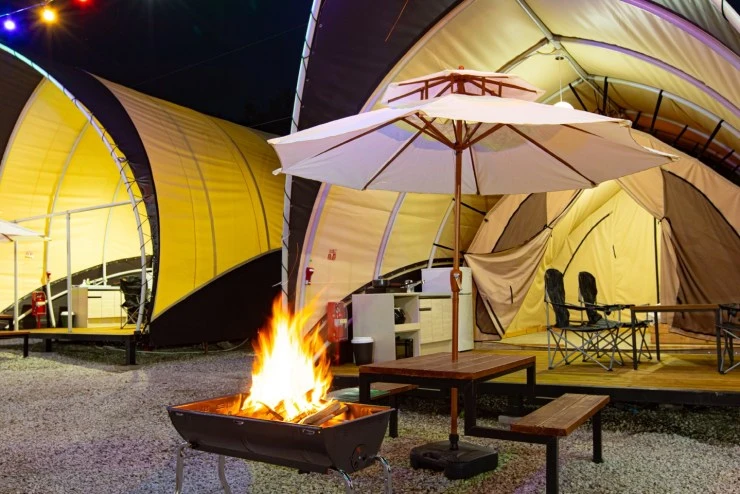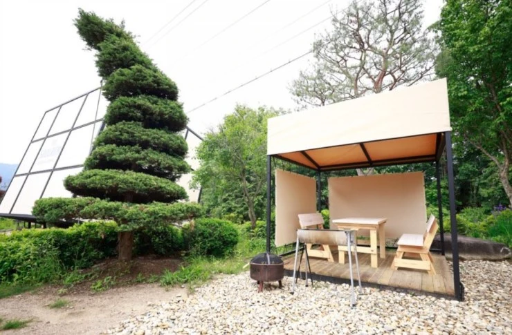 큐브 글램핑에는 각 객실마다 독립된 바비큐 테라스를 갖추고 있다. 숯과 그릴은 3만 원에 이용 가능하며, 물론 불멍만 즐기고 싶다면 2만 원에 화로대와 장작 세트를 2만 원에 이용할 수도 있다.