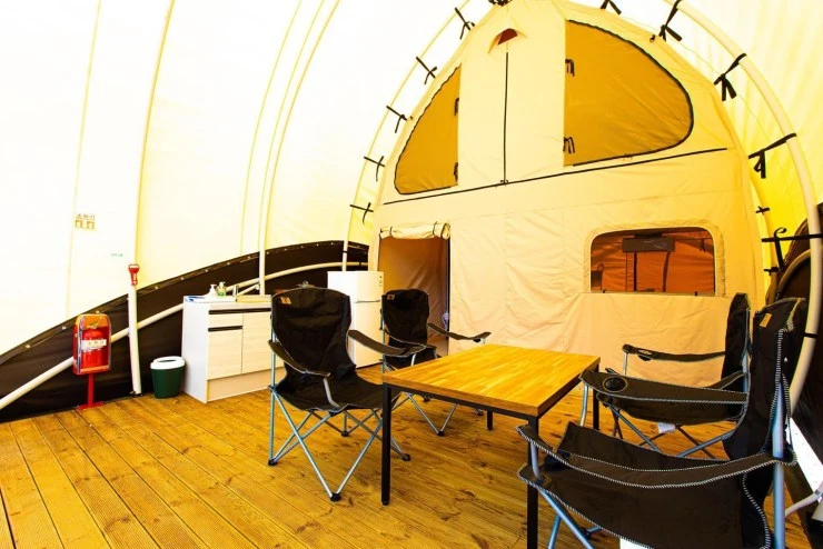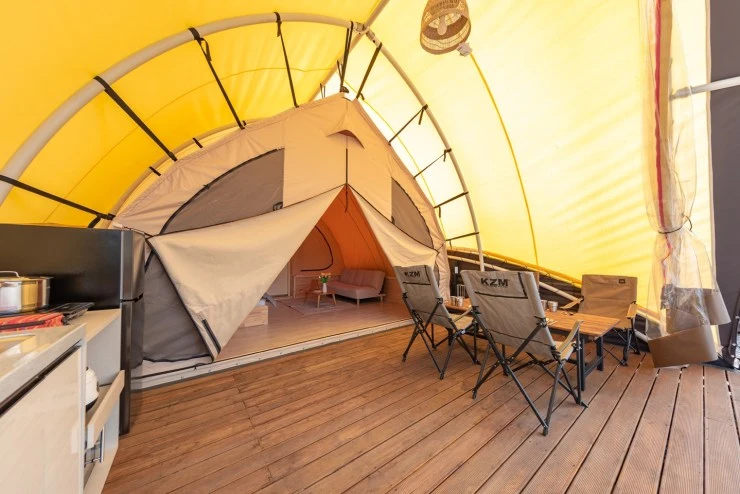 침실과 개별 테라스, 개별 욕실로 구성된 노블 글램핑의 럭셔리 오페라로 구비시설은 침대, 소파베드, 최신 냉난방기, 냉장고, 4인용 캠핑의자와 식탁이 준비된다.