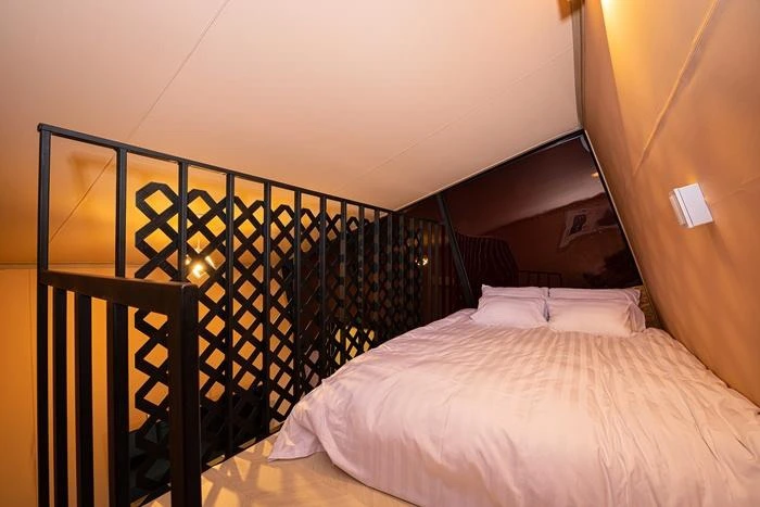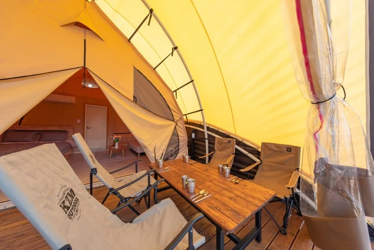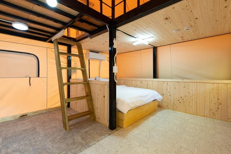 복층형 침실과 개별 욕실, 테라스를 구성한 운악산 글램핑의 프리미엄 오페라 A 룸인데, 객실 내부에는 침대와 에어컨, 냉장고, 간이 싱크대, 4인용 캠핑 의자, 식탁 등이 준비돼 있다.