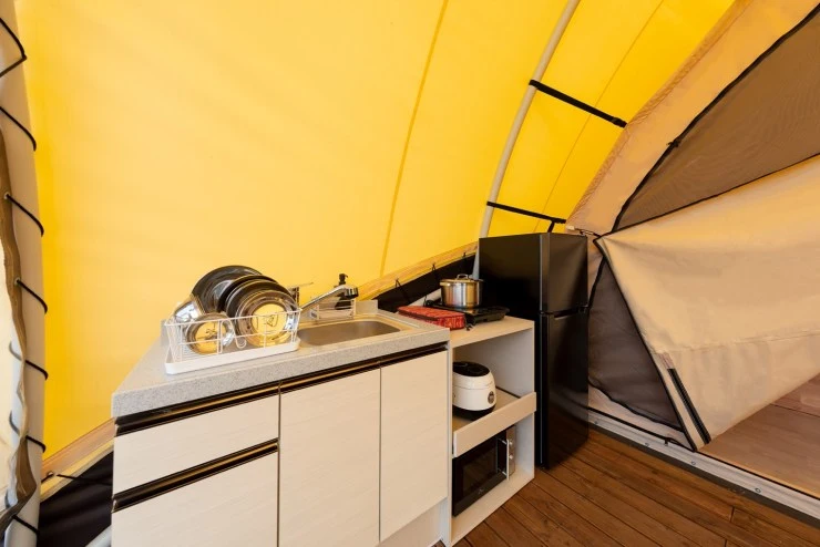 모든 객실에는 개별 데크와 주방이 설치되어 있다. 냉장고, 식탁, 밥솥, 인덕션, 냄비, 프라이팬, 전자레인지, 식기류, 주방세제까지 준비되어 있으며, 아침식사와 저녁 바비큐까지 알찬 캠핑 요리로 챙겨보자.