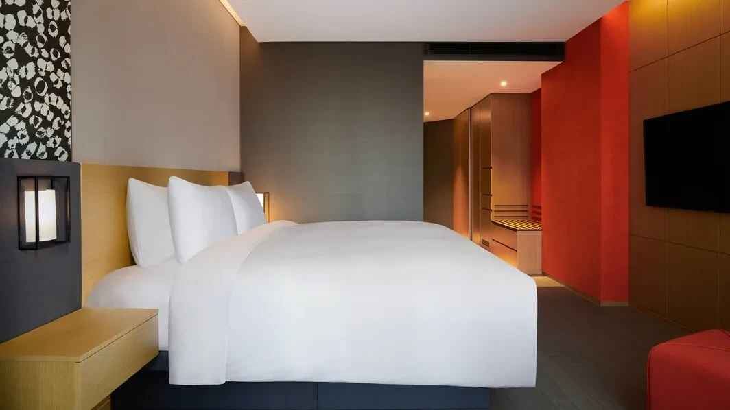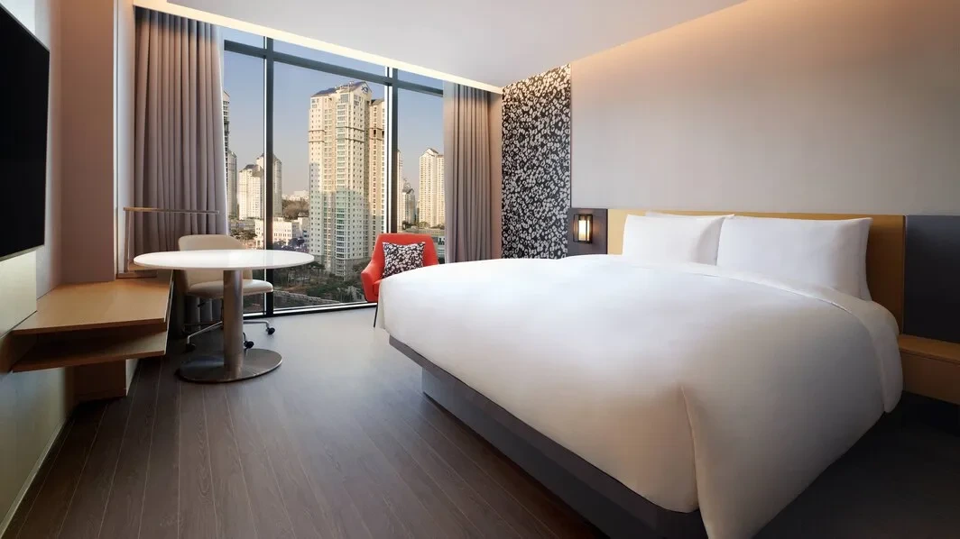 코트야드 메리어트 수원 호텔 프리미어룸 킹 침대는 기본 객실이지만 층고가 높고, 한쪽 벽면이 창문으로 이루어져 탁 트인 수원의 시티뷰를 감상할 수 있어 커플 호캉스에 인기가 높다.