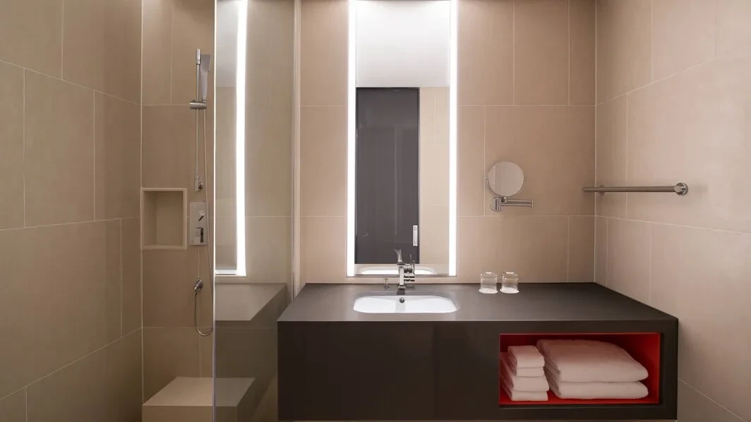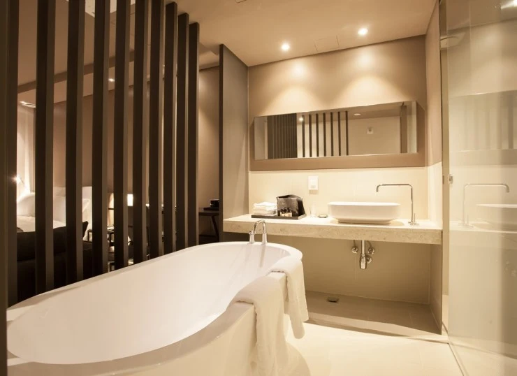 욕실에는 욕조와 세면대가 설치되어 있고, 변기만 분리된 공간에 설치되어 있다. 어메니티로는 아베다 제품으로 샴푸, 린스, 바디워시, 바디로션, 비누가 준비되며, 헤어드라이기, 수건도 갖춰져 있으니 몸만 편히 와도 될 정도다.