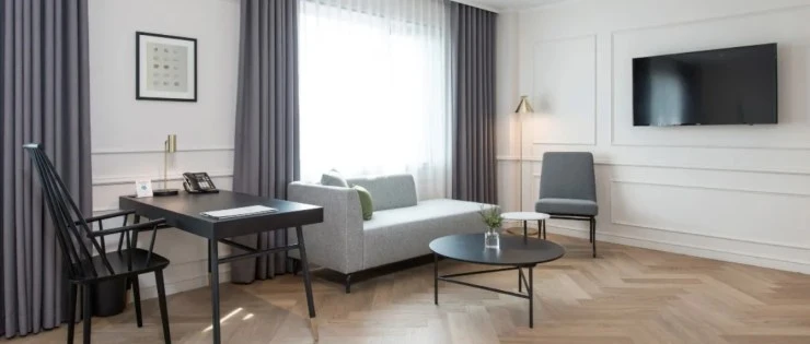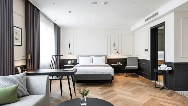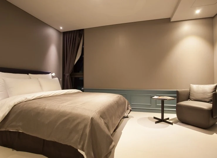 모던한 분위기를 띠고 있는 수원 호텔 가덴의 슈페리어 더블룸! 기본 객실이지만 널찍한 구조에 최신 노트북, TV, 더블베드, 1인용 소파와 테이블 등이 준비돼 있어 커플 여행에 인기가 높다.