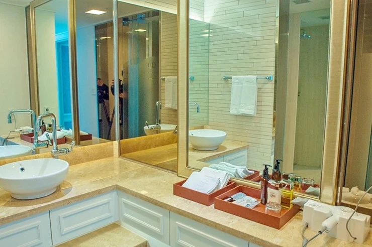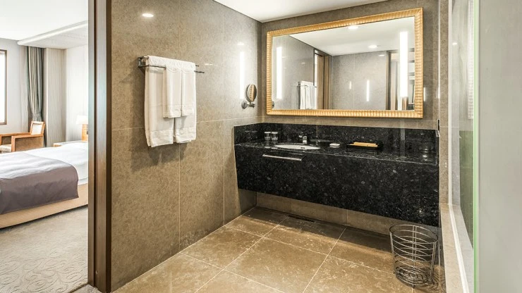 욕실에는 세면대와 변기, 욕조, 샤워공간이 모두 별도로 마련되어 있다. 어메니티로는 샴푸, 린스, 바디워시, 비누, 스킨, 로션, 칫솔, 치약, 면도기, 샤워캡, 목욕가운, 수건 등이 제공된다.