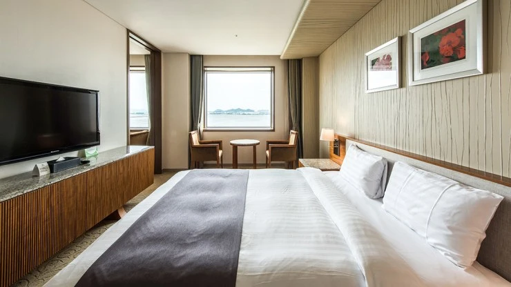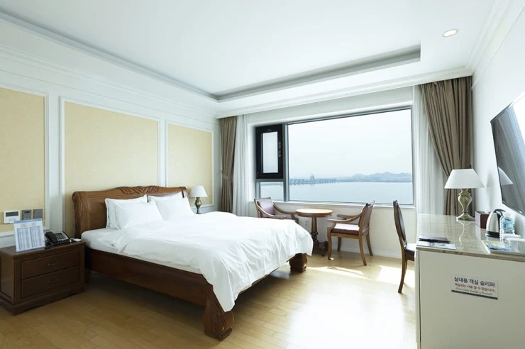 목포 바다가 한눈에 보이는 매력적인 디럭스 더블룸은 커플여행에 특히 인기 있는 객실이다. 널찍한 더블침대와 침대, TV, 테이블, 의자, 협탁 등이 갖춰져 있다.