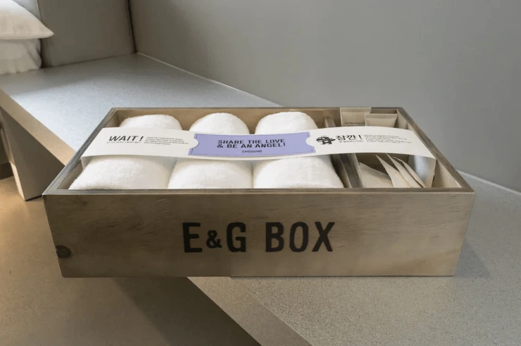 욕실에는 독일 친환경 브랜드의 샴푸와 컨디셔너, 물비누를 디스펜서 형태로 비치해 놨다. 객실 Earn & Giveaway Box에는 칫솔과 치약, 로션, 화장솜, 면봉, 빗, 수건 등 일회용품이 담겨 있다.