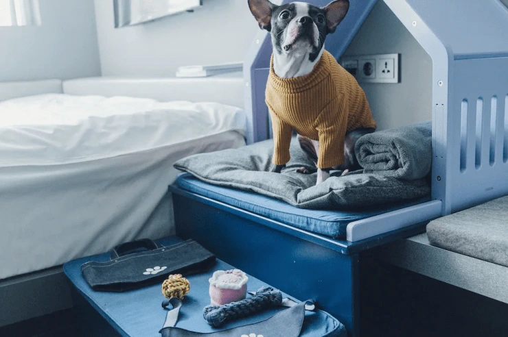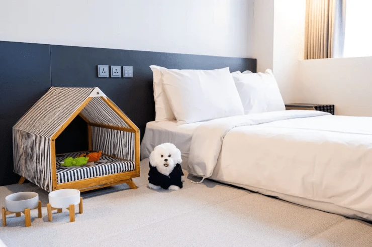 반려견 동반 가능한 호텔 카푸치노 인기 객실이다. 넉넉한 퀸사이즈 침대 2개와 텐트형 도그 하우스를 갖췄다. 강아지 관절을 생각해, 폭신폭신한 미끄럼 방지 패드 카펫을 설치해 놨다.