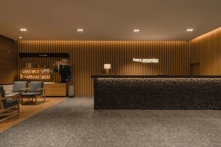 1층 로비는 우드톤의 제주스러운 인테리어로 꾸며 놨는데, 같은 층에는 책 대여가 가능한 헤이 북스가 자리했다. 이외 헤이 서귀포 부대시설로 일하기 좋은 카페와 감성 펍, 굿즈숍, 코인 세탁기 등을 갖췄다.