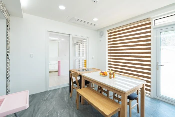 바비큐가 가능한 개별 테라스도 갖추고 있다. 더 좋은 점은 전기 그릴은 별도의 요금 없이 무료로 사용 가능하다! 바비큐 테라스에서는 수영장이 창문으로 보여, 아이들은 물놀이를 즐기고, 엄마와 아빠는 바비큐를 준비하며 지켜볼 수도 있다. 미온수 사용 요금은 3만 원~ 5만 원 정도가 발생한다.