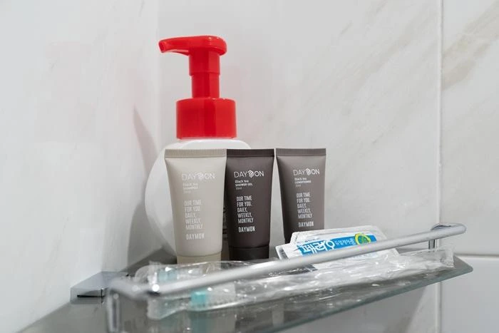 욕실에는 샤워부스가 설치되어 있고, 어메니티로 샴푸와 린스, 샤워젤, 바디로션, 수건, 헤어드라이기 등이 준비된다. 개별적으로 치약과 칫솔, 클렌징 폼, 면도기는 챙겨 와야 된다.