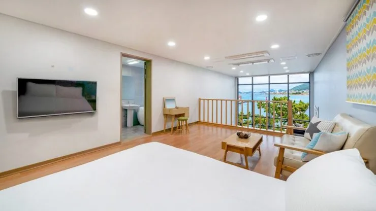 독채풀빌라 101호는 복층 객실로 시원한 오션뷰를 감상할 수 있는데, 침실+복층 침실+거실로 구성되어 있는 30평형으로 커플은 물론 가족 여행객도 편히 머무를 수 있다.