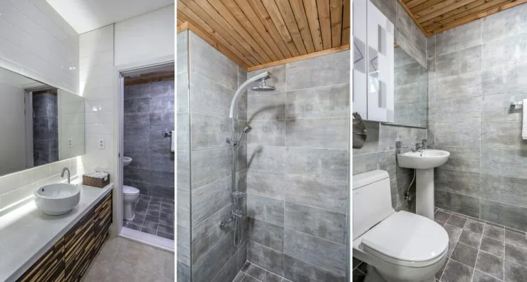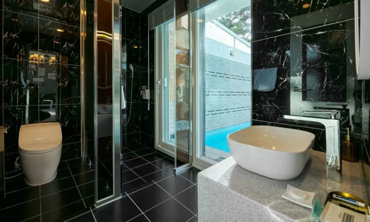 어메니티는 샴푸, 린스, 바디워시, 치약, 칫솔 등이 꼼꼼히 구비되어 있다. 수영장과 화장실이 연결되어 있어 편리하다.