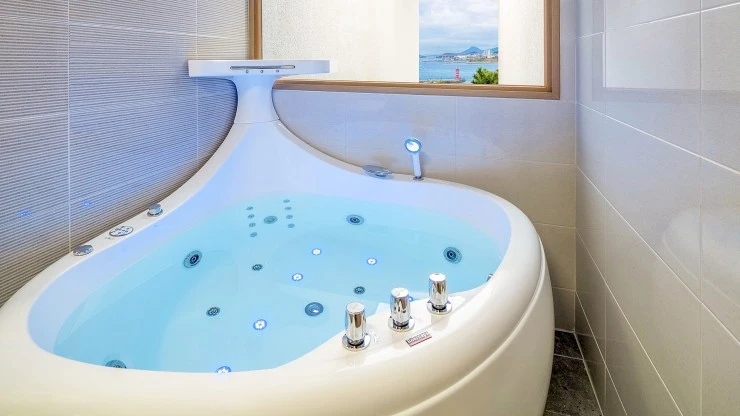통영 풀빌라는 스파동 201호, 202호 / 독채온수풀빌라 101, 102호에서 오션뷰 스파도 즐길 수 있다. 바다가 바로 앞이라 전망이 아름답고 산책하기도 좋다.