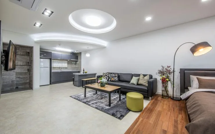 객실은 거실과 침실(더블 1+싱글 1), 테라스로 구성되어 있다. 실내 취사가 가능하며 정수기와 캡슐커피 머신까지 완비되어 있다. 공기청정기도 있어 쾌적하게 머무를 수 있다.