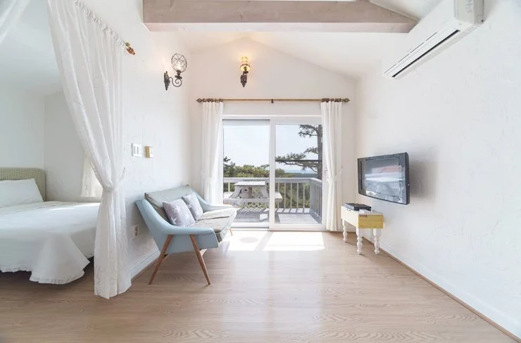전 객실 독채로 매우 프라이빗하게 머물 수 있는데, 프린스는 화이트톤의 세련된 인테리어가 돋보이는 태안 감성 숙소이다. 커플이 머무르기 좋은 구조로 탁 트인 바다 전망도 누릴 수 있다.