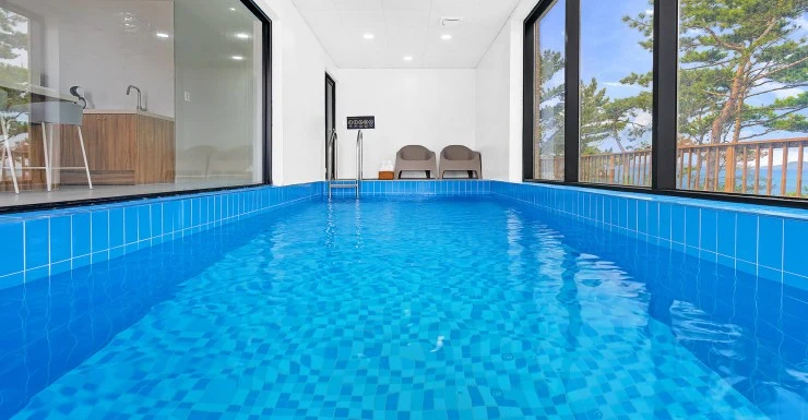 모든 객실에는 넓은 개별 수영장이 준비되어 있다. 미온수 신청은 필수이며 추가 요금 50,000원이 부과된다. 나만의 수영장에서 프라이빗한 물놀이를 즐겨보자. 체크인은 15시부터 가능하며 체크아웃은 11시까지다.