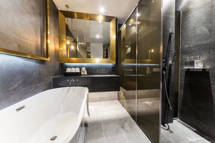 건식 세면대와 욕조, 샤워 공간이 분리돼 있다. 어메니티로 샴푸와 컨디셔너, 바디워시가 리필형 용기에 제공된다. 아울러, 칫솔과 치약, 면도기, 스킨, 로션, 비누, 수건, 드라이기 등을 완비했다.