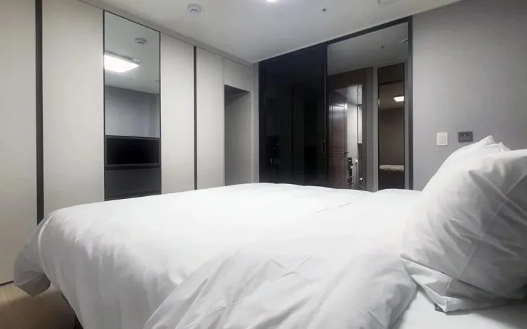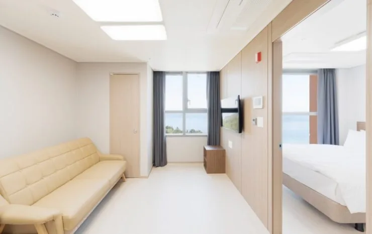 디럭스 더블룸은 요즘 동해 한 달 살기 숙소로 떠오르고 있는 곳이다. 거실과 침실이 분리돼 있는데, 커다란 통창이 있어 탁 트인 바다 전망을 감상할 수 있다. 아울러 객실에 세탁기, 냉장고, 수납공간도 모두 갖추고 있다.