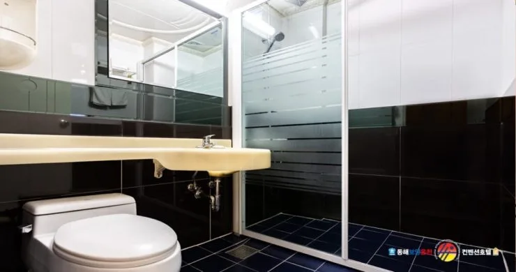 욕실에는 샤워부스가 설치되어 있고, 어메니티로 샴푸, 린스, 바디워시, 비누, 바디스펀지까지 제공된다. 단 일회용 칫솔, 치약, 면도기는 제공하지 않고 있으니, 로비의 자판기에서 유료로 구매 또는 개별적으로 챙겨 오면 된다.