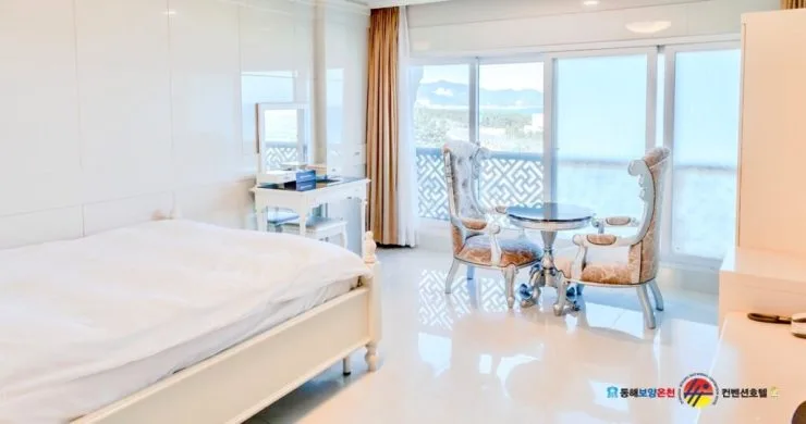 사진 속 객실은 스탠다드 오션뷰인데, 화사한 화이트 톤의 인테리어에 전면 오션뷰 테라스를 갖춘 객실로 겨울 바다를 바라보며 여유로운 힐링을 즐기기에 제격인 곳이다! 내부에는 더블베드와 다이닝 테이블, 화장대 등이 준비돼 있다.