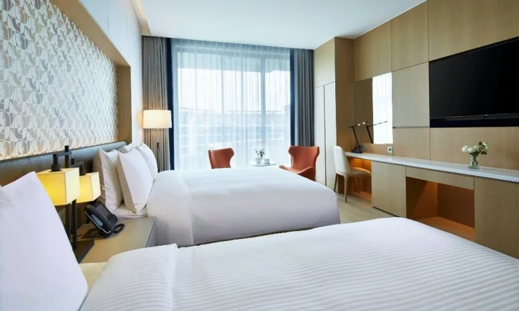 퀸 베드와 싱글 베드를 비치해 제주도 가족 여행에 안성맞춤인 객실이다. 조명과 실내 온도를 쉽게 조절할 수 있는 스마트 컨트롤 시스템을 갖추고 있으며, 심플한 베이지 톤 가구와 간접 조명을 사용해 편안함을 극대화했다.