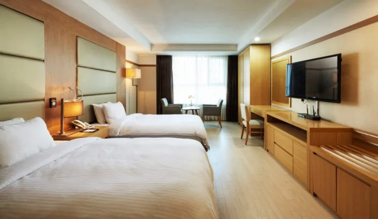 지지호텔은 가격 대비 넓은 면적으로 편하게 머무를 수 있는 숙소로 스탠다드 트윈룸은 따뜻한 분위기의 객실이다. 트윈베드와 사이드 테이블도 있어 편안한 휴식을 보장한다.
