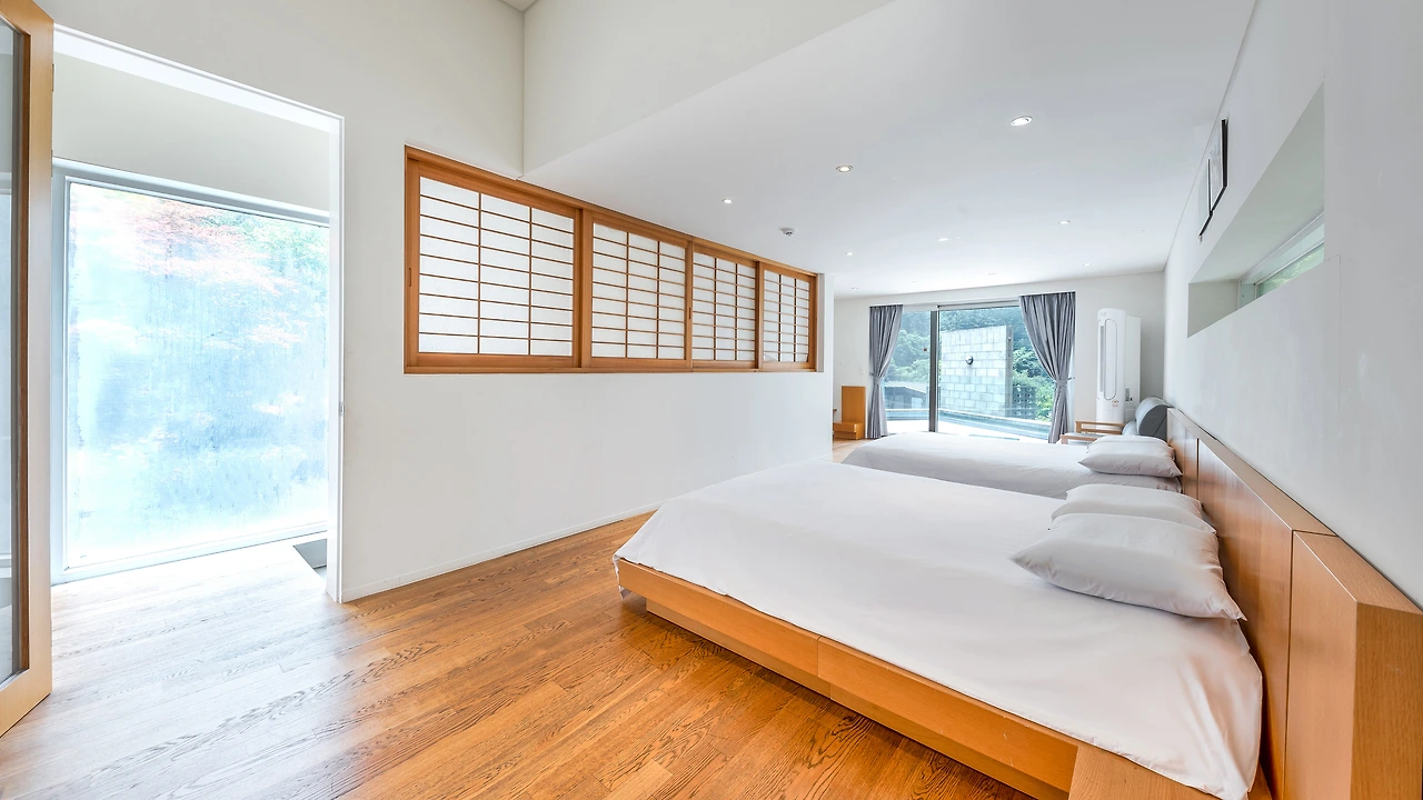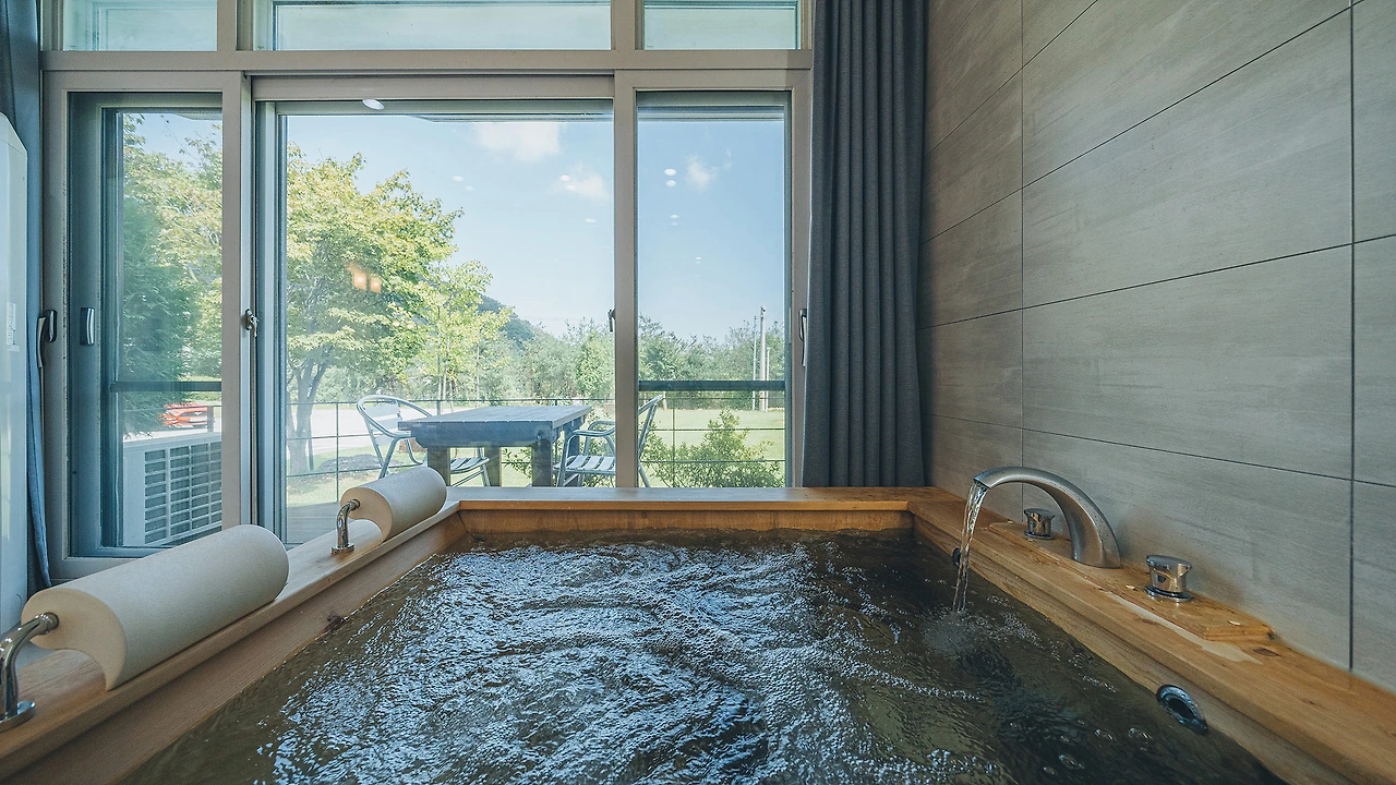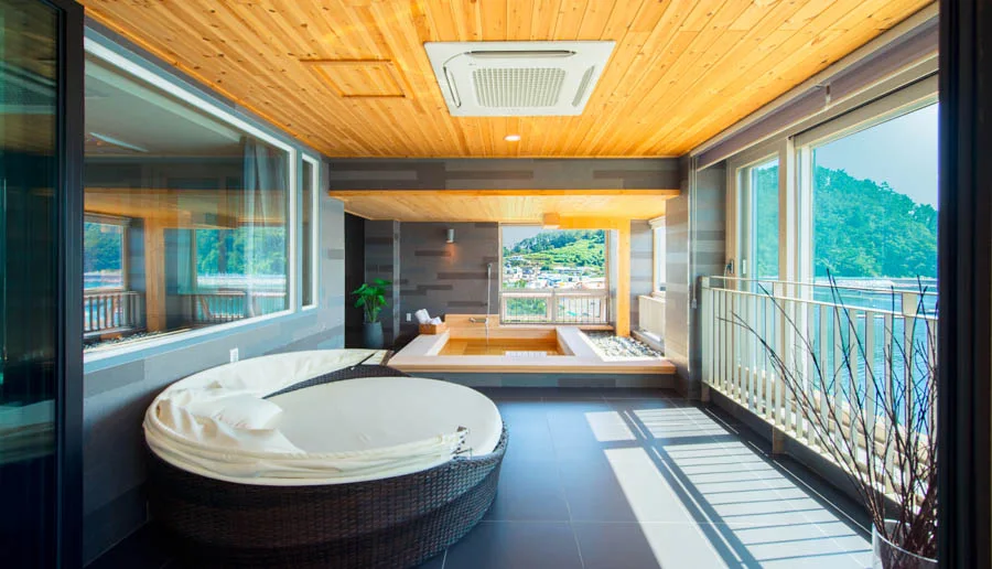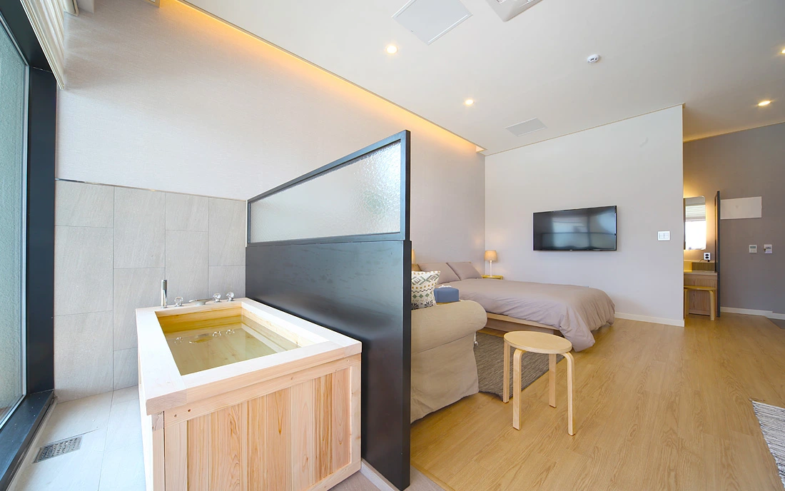 객실 내부는 원목을 활용해 따뜻한 분위기를 띠고 있는데, 특히 모든 객실에는 실내 히노끼탕 또는 야외 미니풀을 갖춰 풍경을 감상하며 여유로운 물놀이를 즐길 수 있다.